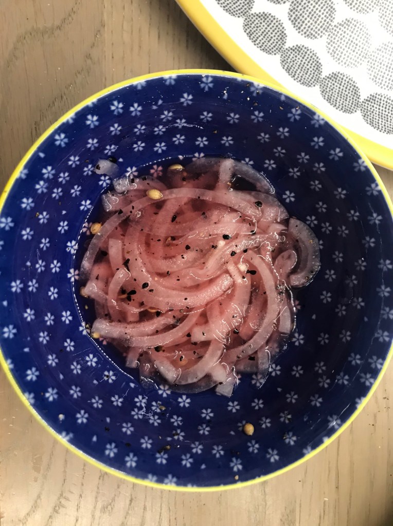 Prepare your basting sauce by combining Soy Sauce, honey and sweet chilli sauce; whisk it with a fork or shack up in a jar. You can prepare your Pickled Onion now, combine the vinegars’, sugar, salt and pepper in a bowl and warm through in the microwave, 30 seconds are fine. I added some red food colouring to give it the authentic colour and a pinch of onion seeds. You could use red onion and skip the food colouring.