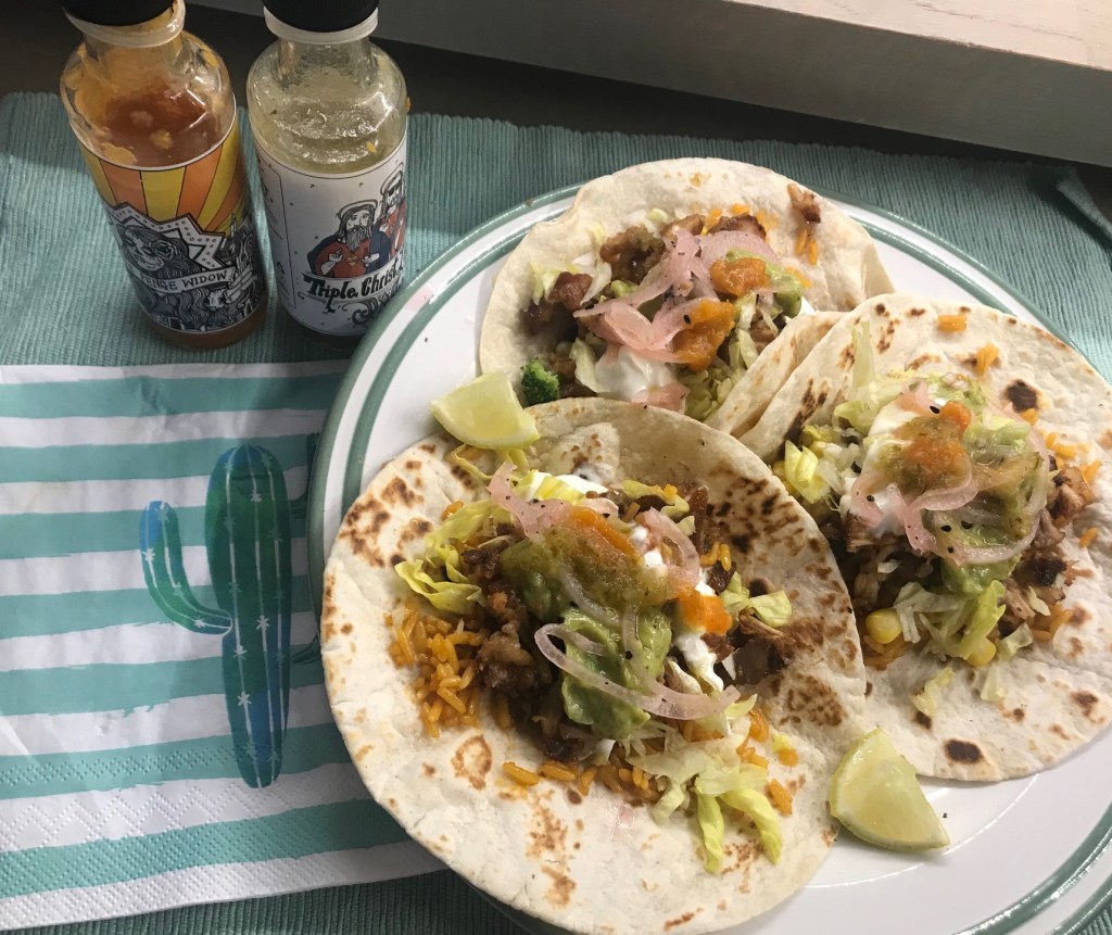 The brushed both sides of the mini wraps and toasted them in a hot pan then topped with a little Mexican rice, pulled pork, Guacamole, yogurt, shredded lettuce and picked onion. Finally, some hot sauce from the guys at All Sauce and some lie wedges. Taco truck delicious!!