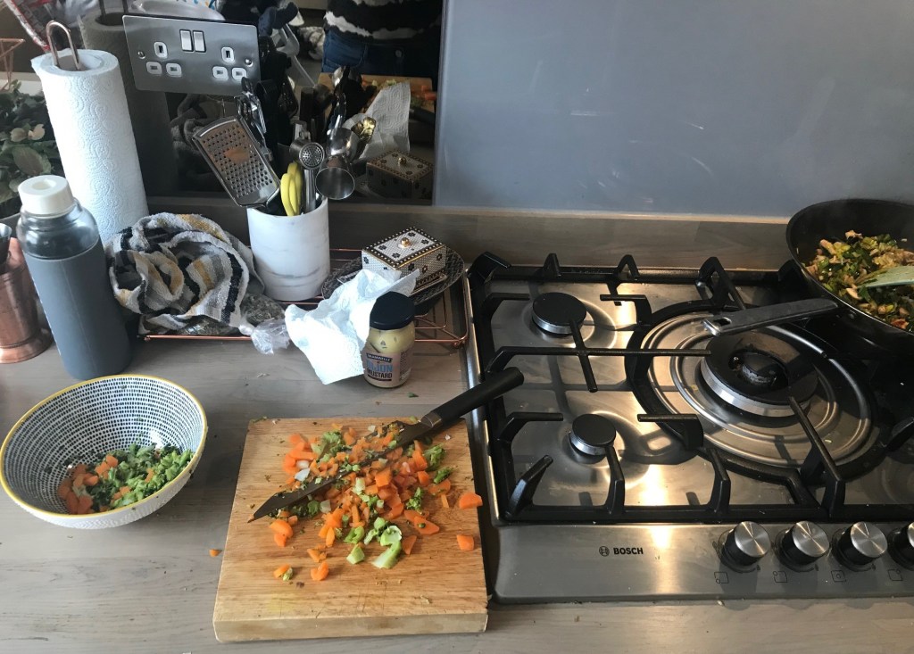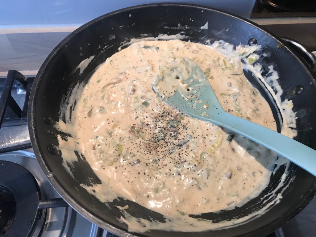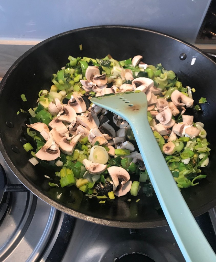 Fry the leaks for 2 minutes in some oil of your choosing, then add the mushrooms and a bit of butter and the garlic. Meanwhile steam your carrots and broccoli in the microwave and chop into 1cm or smaller chunks once soft. I was doing a hidden veg vibe, so they don’t bite into something and pick it out so chopped them quite fine.