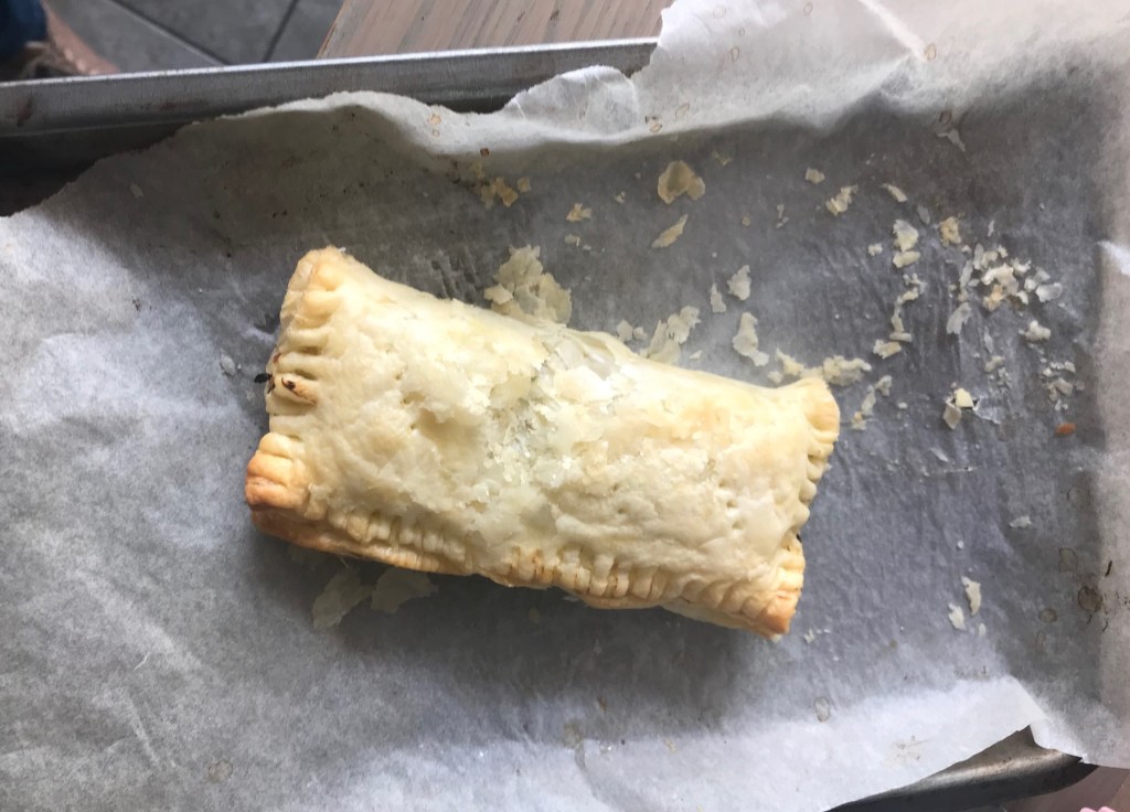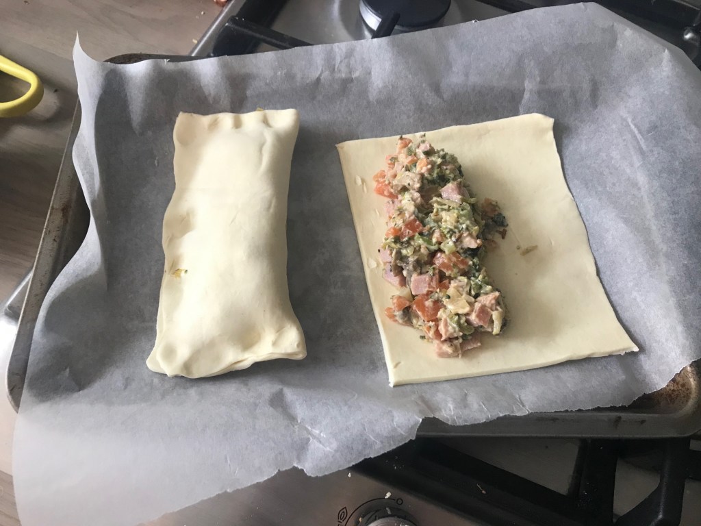 Mix the gammon cubes into the rest of the children’s mixture once it is cooled. Place the mixture in one half of the pastry and fold over, you may need to tuck it a bit so it all fits and then with a fork push the edges together. Back for 15-20 minutes at 200 degrees.