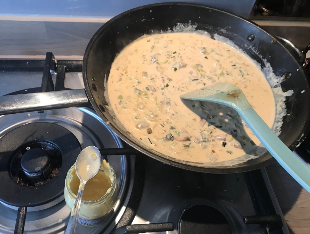 Now put in in a bit of butter, how much is up to you really, add the flour and stir through the butter, remove from the heat after a minute or so and pour in the cream and stir the entire dish add a little milk to loosen and the Dijon mustard. Put back on the heat, as the mixture thickens add more milk till it is the consistency you want, then turn off the heat. At this point remove to spoons of the sauce and add to the baby’s veg and put 30g of cheese in too and mix. You will see it is mostly vegetables and just enough sauce and cheese to bind it. Add cheese to the adult portion and stir through, it is enough for 4 medium pie’s the same as the children’s or one large lidded pie. I added a pinch of toasted and ground fennel seeds, but it is a strong flavor so only add it if you love it and it is really not necessary.
