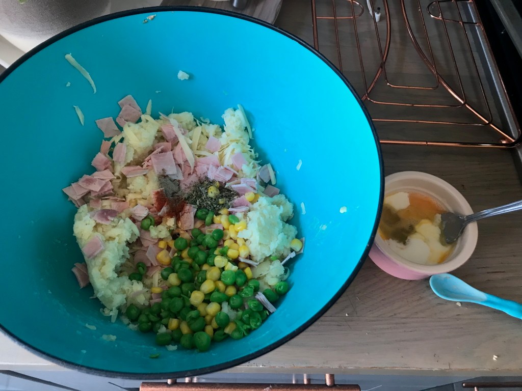 To the mashed potato add a bit of butter and splash of milk so you can mix it well. To this add your cheese, ham, vegetables and herbs and spices mix through. Feel free to substiture the vegetables for something you or your little ones love! Wisk your eggs with a bit of milk and add that to the mix combine well. You can separate your eggs and whisk the egg white and fold through after but for a busy lift there is no need for that.