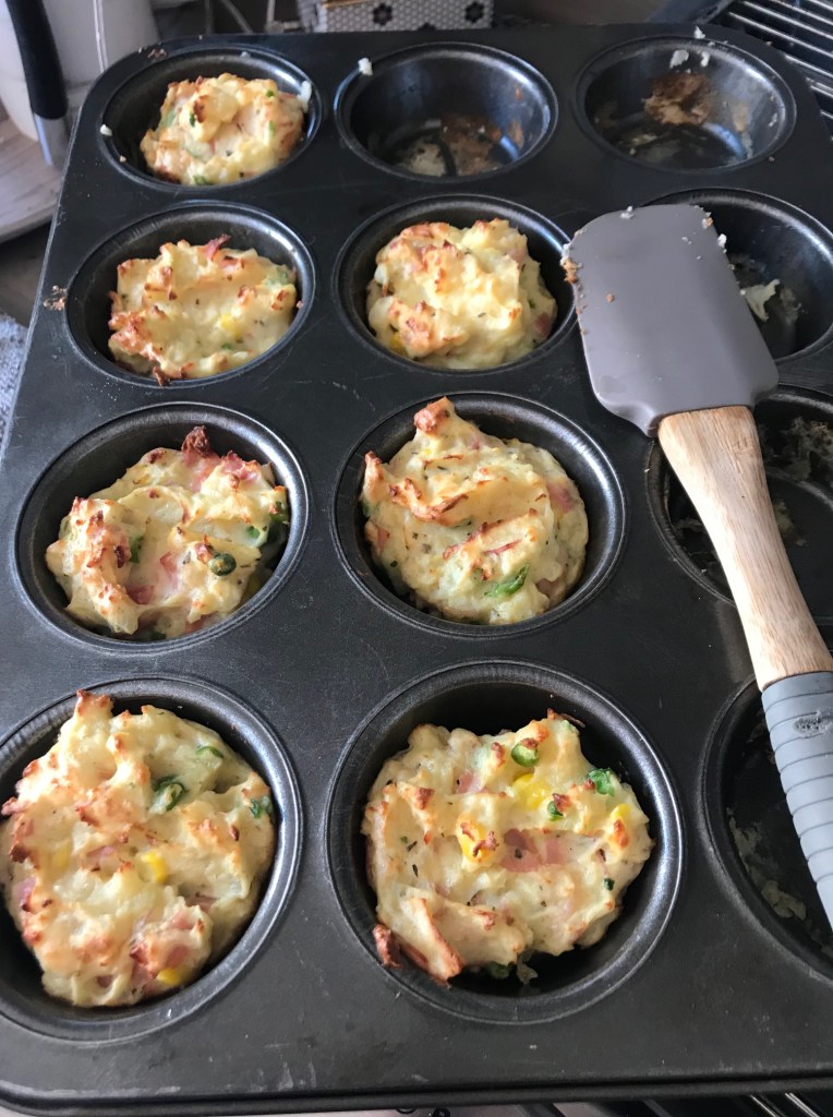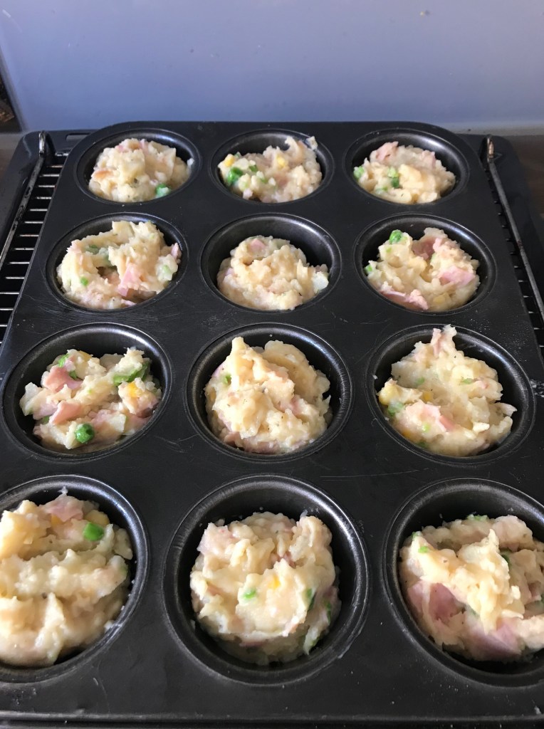 Spoon your mixture into greased muffins tray, mine stuck a little so I searched, and online they advised butter and breadcrumbs… Mamma ain’t got no time for that but you are welcome to add that step.