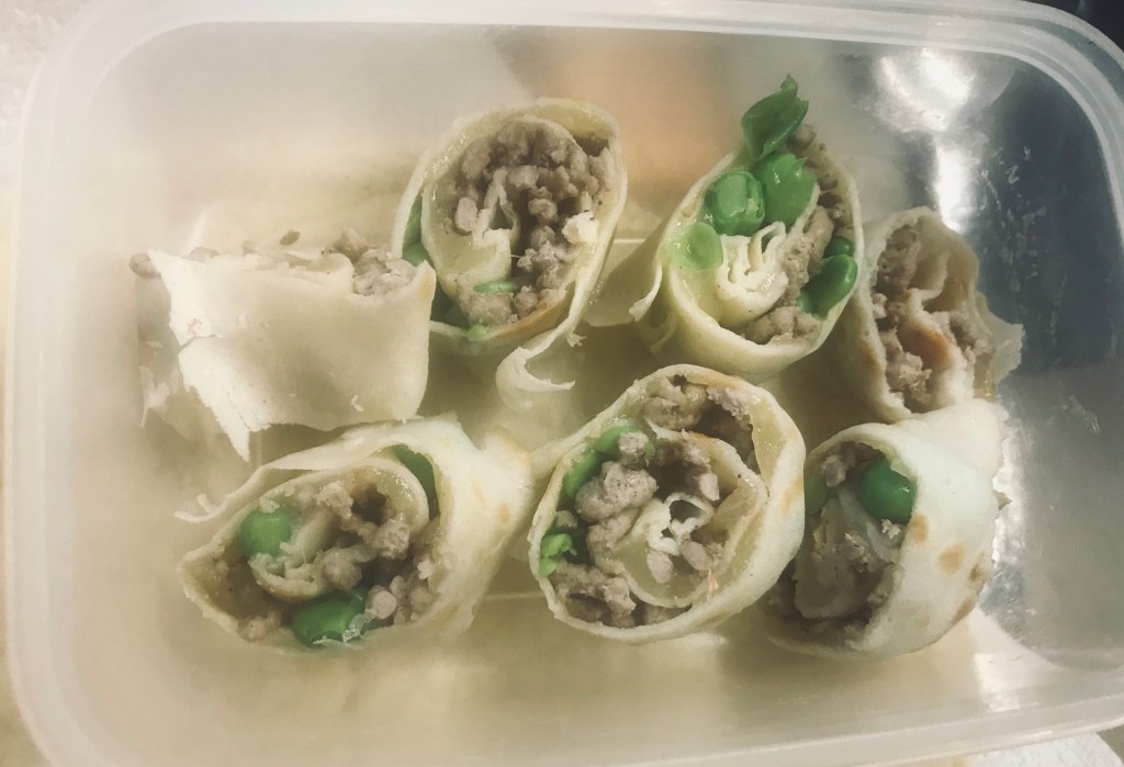 Once you have flipped the pancake and it looks well cooked flip it back as the first side should be on the outside (this step is not needed just how I was taught).  Sprinkle your cheese and then mince mixture and a few peas if you didn’t add them before. Now slide the pancake onto kitchen roll and roll up by hand.